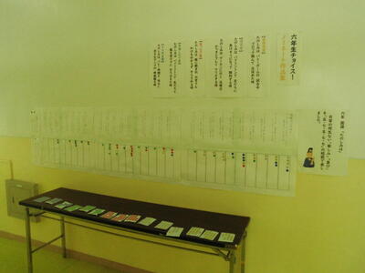 次の写真は、6年生が国語の授業でよんだ短歌を廊下に掲示したものです。