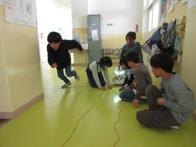 さらに「20mの長い導線を使っても、電気は流れるかな」と聞くと、全員「時間はかかるけど、流れる」と答えました。「糸電話の糸を長くしても、ちゃんと声は届いたから」「流れるのに、10秒ぐらいかかるんじゃない」「いや、20秒はかかる」など、子どもたちから意見がたくさん出ました。「では、電気と競走してみよう」と、廊下に導線を伸ばし、どちらが速く戻ってこられるか試しました。