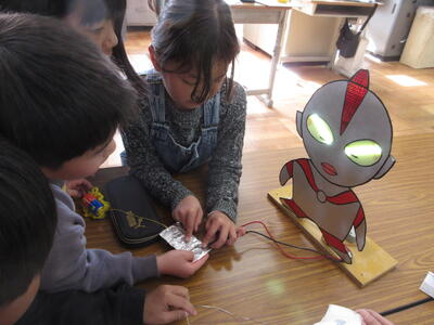 電気が流れるのを調べる道具に「ウルトラマンテスター」を使いました。この道具は、電気が通るとウルトラマンの目が光る仕組みになっています。自分のはさみや10円玉などを使って、目が光るか楽しんで調べました。