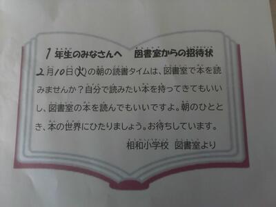 図書室では冬の「冬の読書イベント」が開催されています。その一環として各学年へ「図書室からの招待状」が届いています。普段は火・木曜日の休み時間にしか開いていない図書室ですが、この招待状を持っていけば朝の時間も図書室で本を読むことができます。