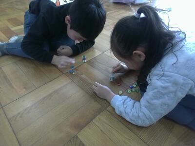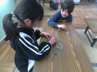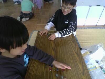1年生の生活科では、日本に古くから伝わる遊びを体験する学習をしています。たこあげやかるた、ふくわらいなどさまざまな遊びに挑戦してきた1年生。2月10日(火)には、みんなで話し合って「おはじきあそび」をしました。