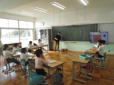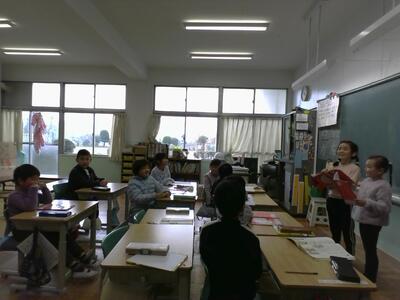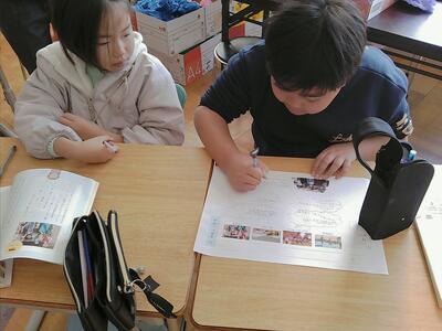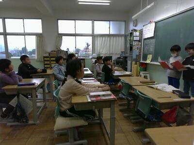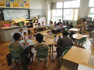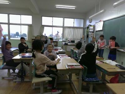 1年生の国語(物語文・説明文)は、年間をとおして、読解から劇、または、ものづくりを繰り返して成長してきたように思います。今回、物語をとおして、「ぼく」と「エルフ」のやり取り、また、家族との関わりについて考えたり発言したりする姿は、自分が登場人物になって役になりきる演者のようでした。