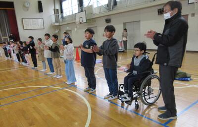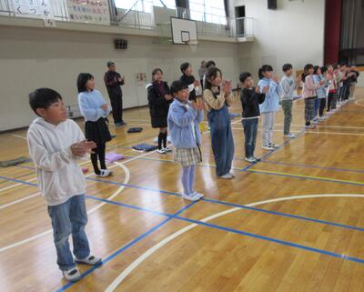 最後に、退場の確認をしました。①の入場練習をよく覚えていて、見送る場所へスムーズに移動していたことがすばらしいと思いました。全体をとおして、あっという間に時間が過ぎ、充実した練習になりました。