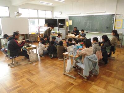 今日は、お弁当の日でした。昼食の時間に各教室を回ってみると、低、中、高と二つの学年が一緒になって、お弁当を食べていました。