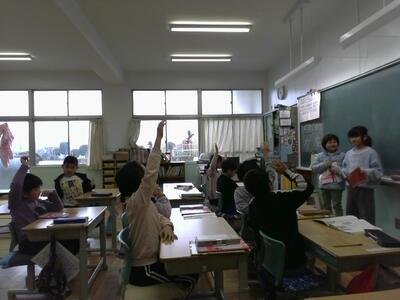週が明けて、1時間目からお楽しみ会をしました。内容は「見つかるな」「12マスおに」「頭おしりゲーム」「ジェスチャーゲーム」「ブラックボックス」です。どれも工夫がされていて、楽しい遊びばかりでした。週末、担当の子たちがお家でお題の内容や小道具の準備をして、しっかり説明をしました。みんなで楽しく遊び、よい思い出になりました。