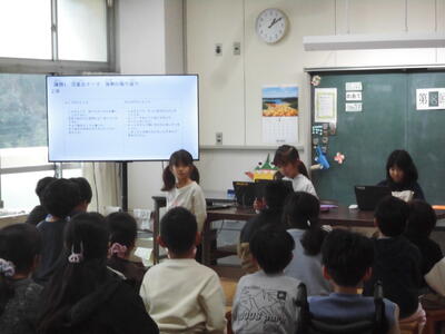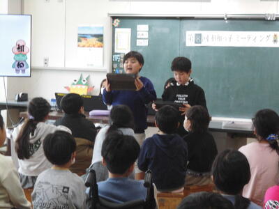 「児童会テーマの振り返り」では、各学年の後期の取組の中で、よくできたところやがんばりたいところの発表がありました。学校のキーワードの一つである「じぶんから」にも、つながる事柄が多く出ていました。