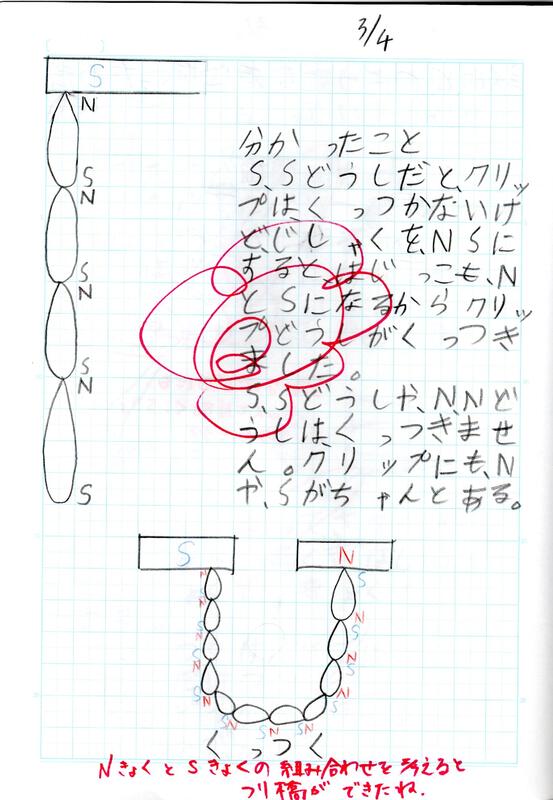 「クリップの先が磁石なら、つながるかな」と考えた子どもたち。だけど、つきません。Kさんはノートにクリップが磁石になった様子を図にしました。「クリップの先が違う極ならクリップ同士はつくはず」と、クリップの先が違う極になるようにすると、2つのぶら下がったクリップをつり橋にしてつなげられました。 (DI)