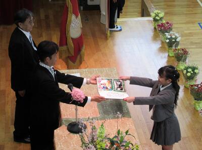 離退任式では、離任される教職員に代表児童が感謝の言葉を伝えたり、花束を渡したりしました。先日卒業した子供たちやそのおうちの方も来てくださり、ありがたかったです。