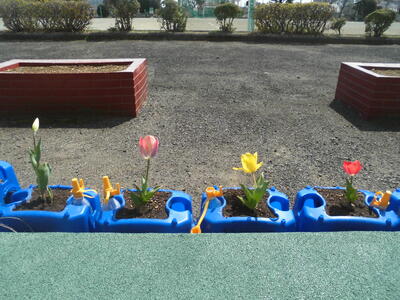 1年生が教室の横で育てているチューリップが、つぼみをふくらませるだけでなく、花を咲かせていました。今日の時点では、10個のうち4つが花を咲かせていました。
