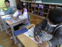次に、線の間を色鉛筆でぬりました。「Sさんの絵はワニに見える」「恐竜かな」「たこにも見えるね」と、子供たちは楽しそうに想像を膨らませました。子供たちの感性は本当に素晴らしいです。(DI)