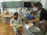 今日から1年生の給食が始まりました。今日は、先生たちがごはんやおかずを器に入れ、子供たちが持ったおぼんによそってもらった器を乗せてもらいながら、動いていく流れで行いました。