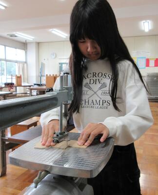 10月の図画工作は、「進め! 糸のこ たん検隊」に取り組んでいます。板の上を探検するように切り進め、切り方や組み合わせ方を工夫しながら工作する題材です。この学びでは、「電動糸のこぎり」を使用します。正しく安全に使うこと、板の切り方、方向転換など、一つ一つ学んでいきました。