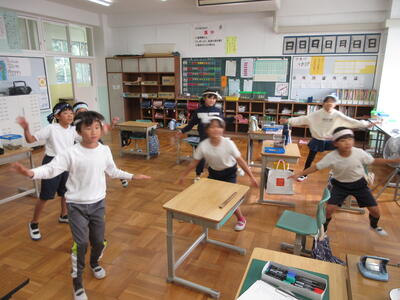 子どもたちはハチマキをして北海の荒波を越えていく漁師になりきり、一生懸命練習しました。想像力を豊かに、楽しく、力強く踊ってほしいです。 (DI)