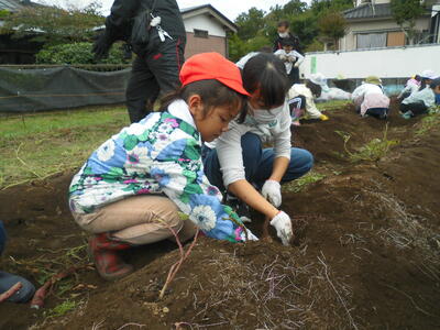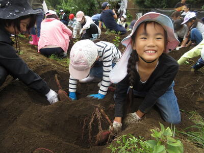 収穫の様子を見ていると、掘っても掘ってもつながっているイモを前に粘り強く掘り続ける子、「助けて」と友達や上級生に手伝いをお願いしている子、やっと掘り出したイモを高々とあげてにこにこしている子などがいました。
