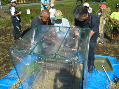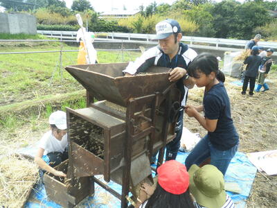 今回の2つの農機具を使った作業は、近年では行う機会がほとんどない貴重なものでした。秋のわりには気温が高かったものの、子供たちは、先生や友達と協力して作業を進めていました。