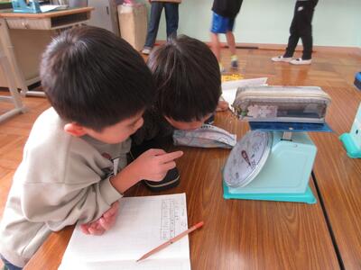 最後にばねばかりを使って友達の筆箱の重さ比べをして楽しみました。(DI)