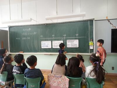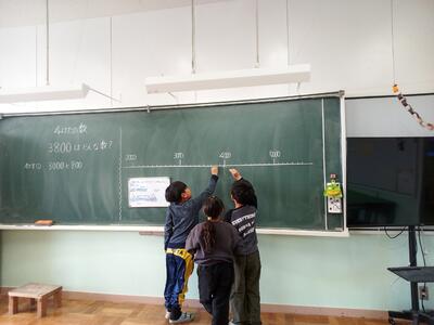 あるグループは「4000−200」 の考え、他のグループは「3000+800」の考えでした。お金に例えて「両替」という言葉を使ったり、「100のまとまりが38個」の図を書いたりして、3グループ3様の考え方がありました。
