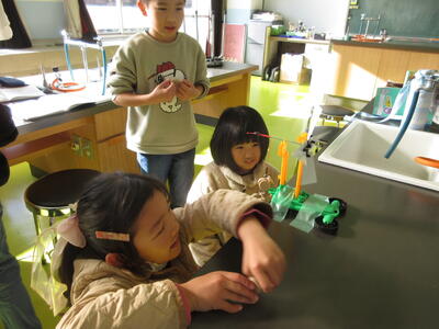 最後に、車に紙の帆をつけて風の力で走る実験をしました。「風を強くすると、教室の端まで走った」など、風の強さによって持ち上げる力や進む距離が変化することを学びました。(DI)