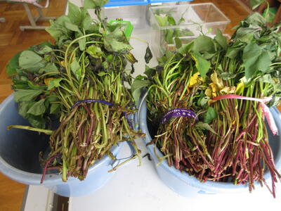 教室で苗の違いをじっくり観察しました。「茎の色が違う」「においはどうかな?」よく見ると、いろいろな違いを見つけられました。その後、チームに配る苗を丁寧に仕分けました。明日が楽しみです。 (いも担当DI)