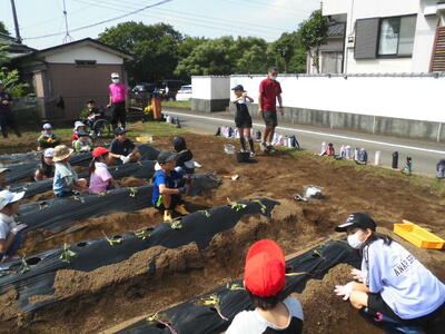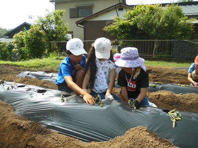 本日1時間目、サツマイモの苗植えを行いました。