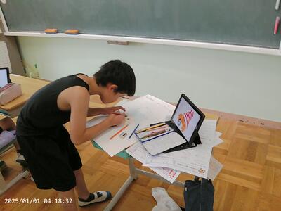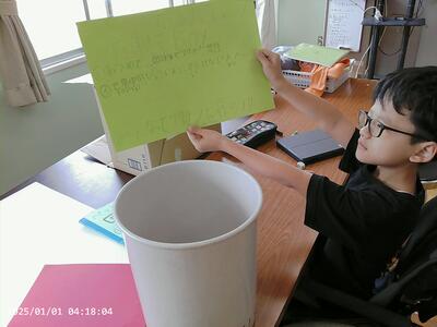 回収ボックス係は、回収ボックスをもっと目立たせよう!とペットボトル回収の言葉や絵、大きさを工夫し、丁寧に描きました。紙の色や言葉、絵もアドバイスをもらいながらこつこつ作っています。牛乳パックの回収ボックスもあるといいかな~と、教師と一緒に作り始めました。