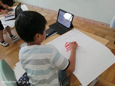 それから半紙に曲がった線やくねくねした線など、いろいろな線を練習しました。「姿勢よく」「筆はまっすぐ立てて」「左手で半紙を押さえて」など、気を付けることがたくさんありました。それでも子供たちは、夢中になって自由にいろいろな線を工夫して書きました。「図工みたい」「おもしろい」など、子供たちの笑顔が見られました。(DI)