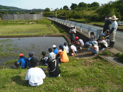 本日6時間目、4・5年生は、地域の方からお借りしている田んぼの様子を見学しました。5月22日(木)に予定されている田植えに向けて、地域学校協働活動推進員のKさんや地域のKさんから説明を受けました。