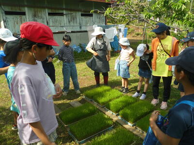 田植えに向け、地域のKさんが子供たちのために世話をしてくださっている苗も見せていただきました。「触っても大丈夫だよ」という言葉を受け、子供たちは苗を優しくなで、「猫の毛みたいだね」と、笑顔で話していました。
