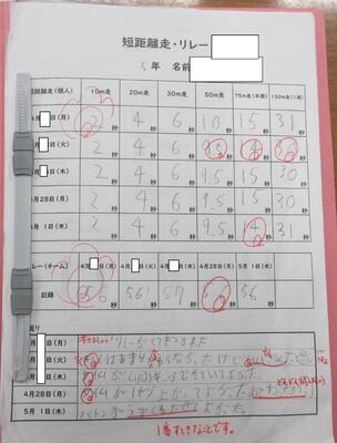 リレーのチームは、子供たち自身で決めるようにしました。また、順位や勝敗がつくことは当然のこと、チームの記録の伸びに向き合い、チャレンジすることを共有しながら行いました。あるチームは、一人一人の走る距離や走順、バトンパスの練習を何度も何度も試しながら練習しました。その結果、順位が上がったり、記録を伸ばしたりする(タイムを縮める)結果につながりました。一つ一つの積み重ねに心から感動しましたし、本人たちも自信になったのではないかと思います。