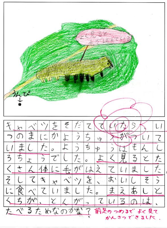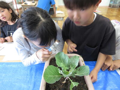 プランターで育てているキャベツを教室に持って来て、虫眼鏡で観察をしました。私は「まずは卵から観察・・・」と思っていましたが、子どもたちはもぞもぞ動く幼虫に夢中になりました。