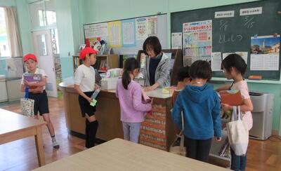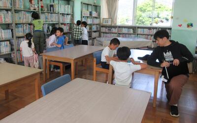 写真は、本を返したり借りたりしているところです。授業中に、たまたま1年生と5年生が重なったことで、新たな関わりが生まれています。図書室での過ごし方、本の探し方、ある本について感想を話したりおすすめの本を紹介したりしています。一人でじっくり読むことも、複数で関わり合いながら楽しむことも素敵だと思います。