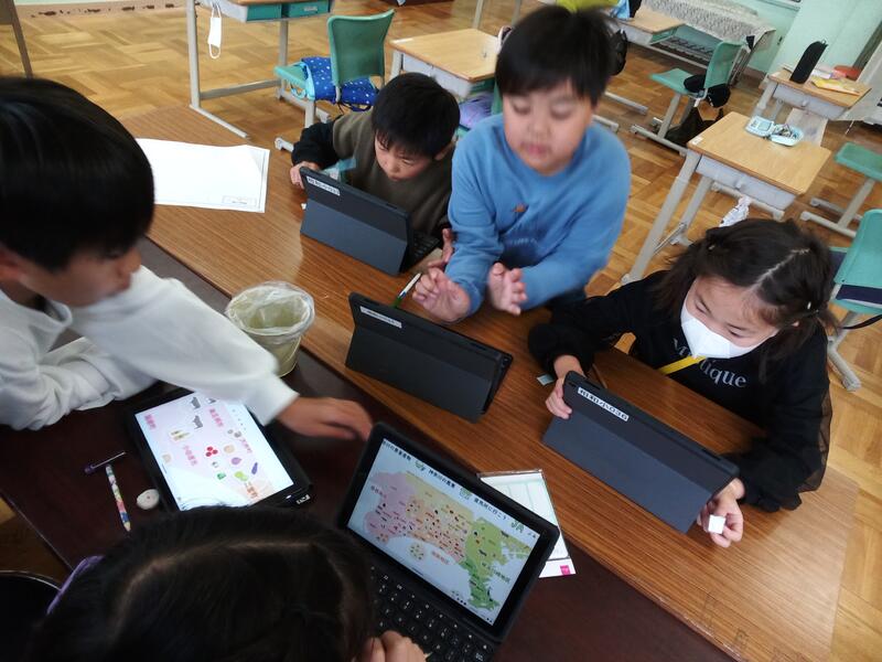 「ねえ、ここのキウイはもうかいちゃった?」「ここの場所、白地図だとどこかな。」「あっ。ここに梅干しが有名って書いてある。私、梅干し好き。」「これ、なんの野菜のこと?」など、声を掛け合ったり、発見した時の感想をつぶやいたり…新たな発見とともに、楽しんで活動できました。