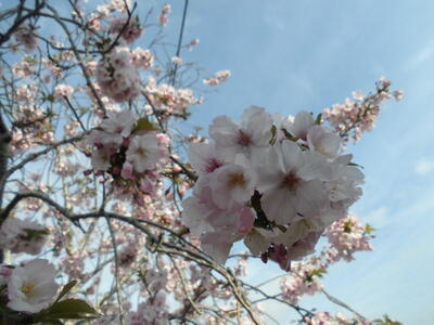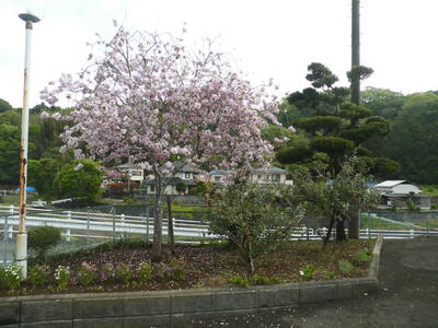 グラウンドのソメイヨシノはすっかり葉桜になってしまいましたが、正門の(道路側から見て)左手にある遅咲きの桜が、今週見頃を迎えています。