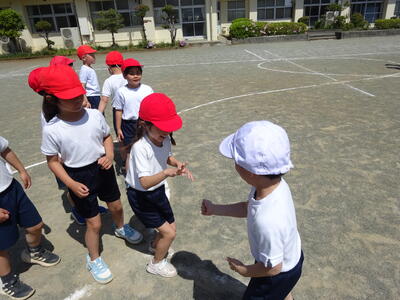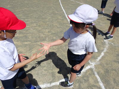 1・2年生を二つに分け、合同のチームを作って対決しました。1年生は2年生と一緒に走ったりじゃんけんをしたりして遊ぶことに喜びを感じているようで、活動中は終始笑顔で過ごしていました。また、2年生は初めての遊びに慣れていない1年生に「こっちにきて!」や「一緒にやろうよ!」など、たくさん声を掛けていて、相和小の先輩として、とても頼もしさを感じました。
