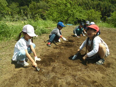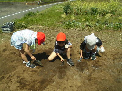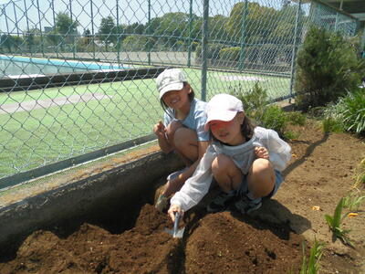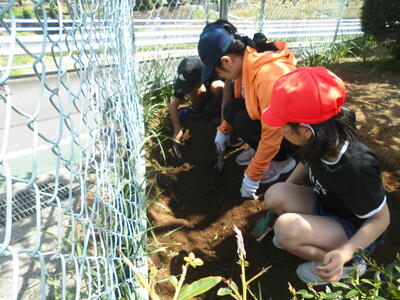 初夏を思わせるような気温となり、半袖で過ごしている子が多くいました。そんな中、今日は、2年生や4年生が栽培活動に向け、畑や花壇での作業をしていました。