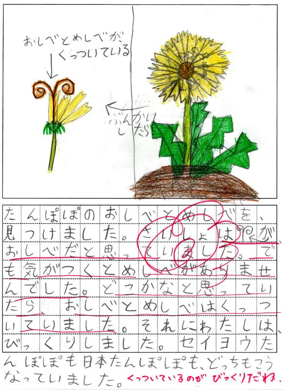 タンポポは細い花びらがつながった合弁花です。この学習はヒマワリの種の観察につながります。楽しみです。(DI)