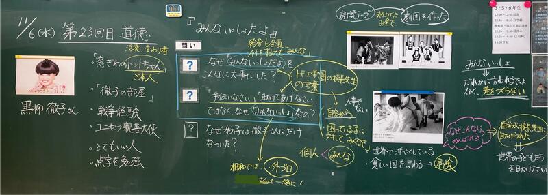 先日、6年生は道徳の時間に「みんないっしょだよ」という教材を扱い、授業を行いました。このお話では、ユニセフ親善大使として30年以上、子供たちのために働いてきた黒柳徹子さんについて綴られています。黒柳さんの心情の根っこにあるのは、ご自身が通った「トモエ学園」の校長先生の「みんないっしょ。」「みんないっしょにやるんだよ。」という言葉でした。子供たちは、教材を読む中で、「なぜ黒柳さんは、何十年も前に校長先生が言われた〝みんないっしょだよ″という言葉を大事にしているんだろう?」という問いを見出し、それについて議論しました。