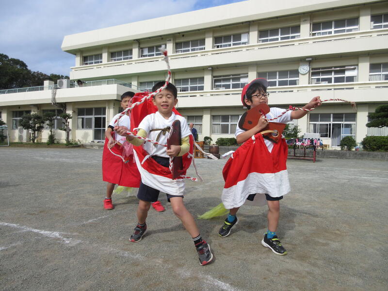 今朝、ハッピー祭で演技する「麦打唄」の練習を全校で行いました。6年生が中心となり、動きの確認をしたり、音楽をかけて踊ったりしました。1年生も真似をしながら動きを覚えています。