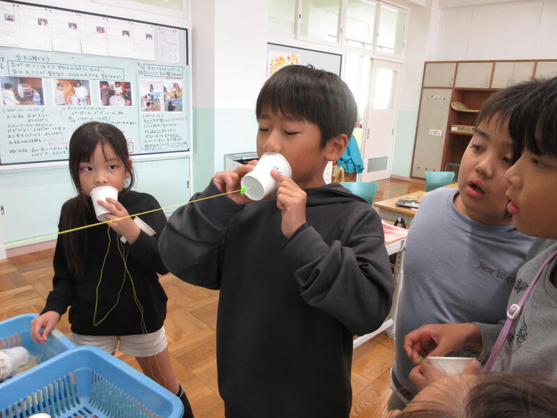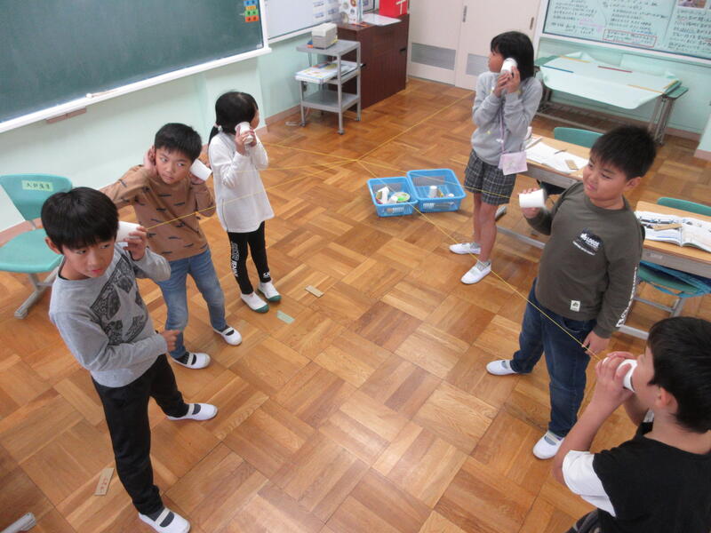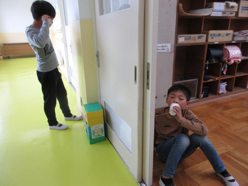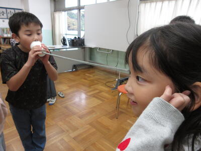 音の伝わり方で、糸電話の実験をしました。「声が聞こえた。」「4人でもできた。」「ピンと張ると糸が震えていた。」など、様々な気付きがありました。震える様子を聞くと、「手にくすぐったい感覚があった。」と話しました。
