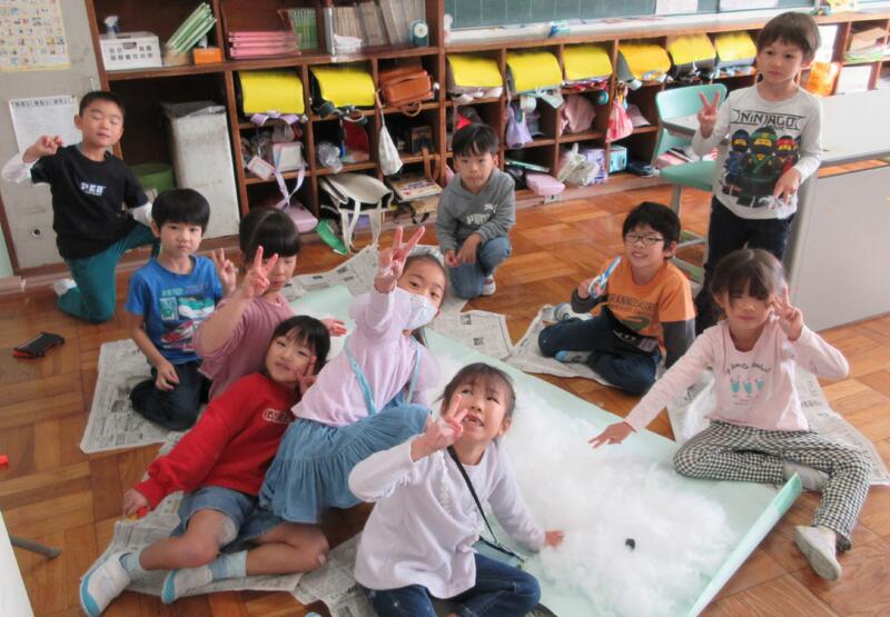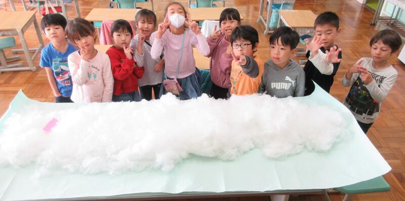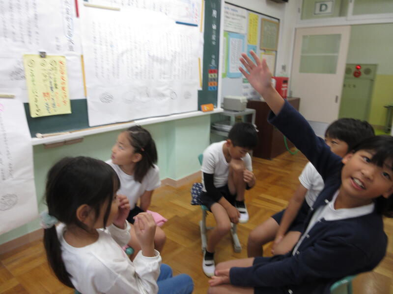 実際に「くじらぐも」をつくることを思い付き、12月に行われる「学習発表会」で発表することを考えました。「何役で出ようかな。」「ちょっと、発表したいことがあるんだけど。」「早く、お話を読み進めないと。」子供たちの発想は、くじらぐもの空のように、どこまでも、どこまでも、つづきます(広がります)。子供たちの思いや願いが叶うように、「何がしたいのか」「どのように準備をするのか」「どんないいことが待っているのか」を引き出しながら進めていきます。