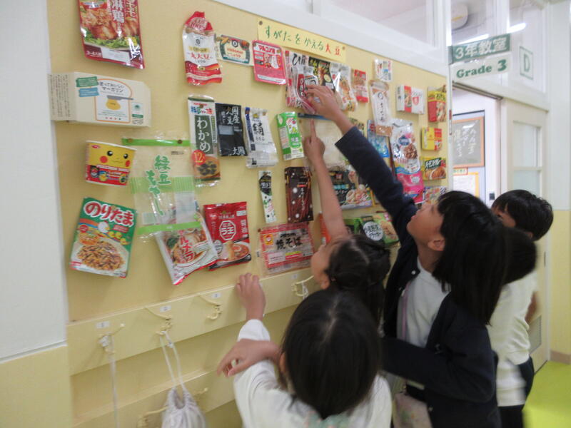 大豆から作られた食品のパッケージを家から持って来てもらい、廊下に掲示しています。たくさんの協力をいただきありがとうござました。既に30種類は集まりました。