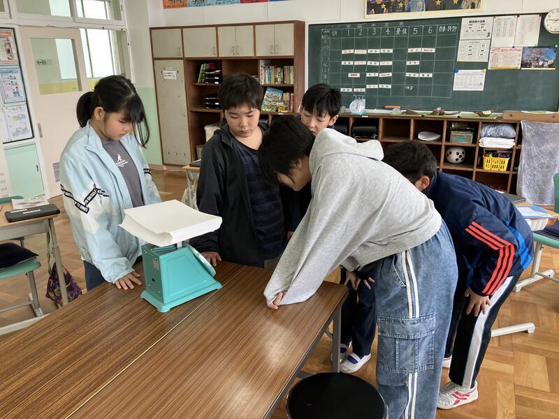 今回の学習では、比例のきまりである、「2つの数量の片方が2倍、3倍…となったとき、もう片方も2倍、3倍となる」という考えを活用し、生活における様々な問題を解決することが目的でした。今回の紙の枚数の問題では、例えば500枚の紙の重さを求め、それを5で割ることで100枚分の紙の重さが求められます。求めたいのは300枚なので、その100枚分の重さを3倍にしたときの重さの分だけ、紙をはかりに置けば、それが300枚であるということが分かります。子供たちはいち早く紙の重さと枚数の比例の関係に気付き、答えを求めようとしていました。最終的に求めた枚数を数えてみた結果は「299枚」と、惜しくも1枚違いでしたが、とてもよく考えていました。