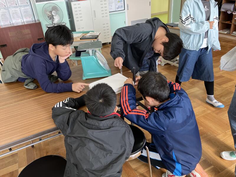 そこで、少し条件を加え、①枚数は10枚までなら数えてOK、②重さや厚さをはかってもOK、と子供たちに伝えました。この瞬間子供たちはピンときたのか、「そういうことか」とつぶやき、それぞれ答えを求めるために考え始めました。ある子は教室にあったはかりを使い、500枚の重さを求めようとし、またある子は、定規を使って500枚の厚さをはかろうとしていました。