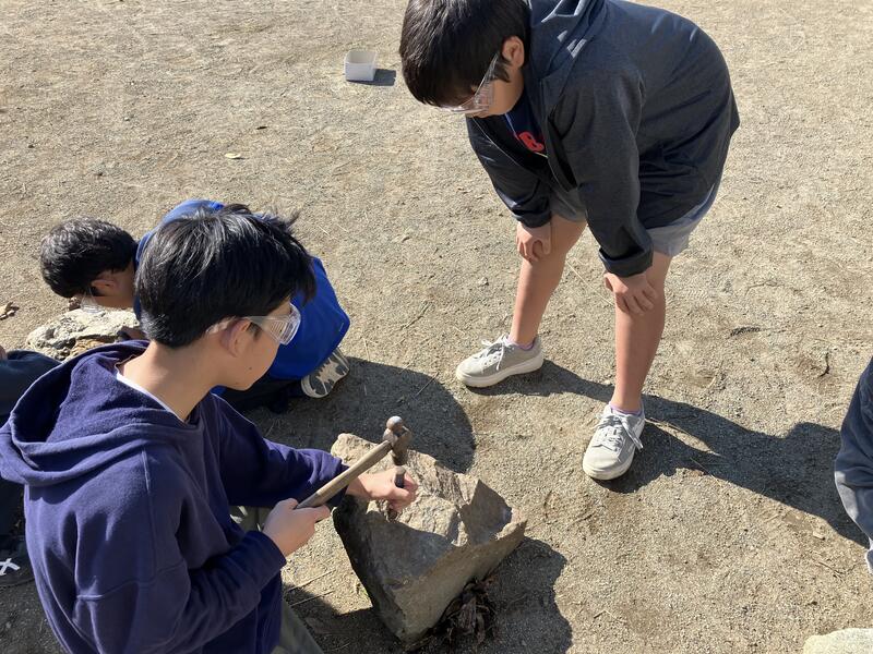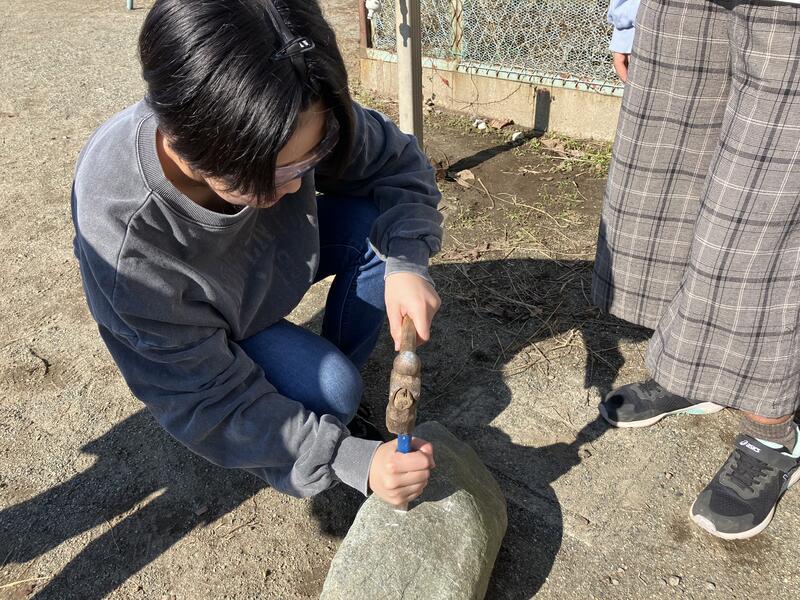 そこで、実際に石砕きを経験することで、教材の登場人物が行ったことが、どれほど大変なことだったのかをイメージすることができるのではないかと考え、実際にやってみました。全員たがねと槌を使い、力一杯石を砕くために叩きます。しかし、砕くことはおろか、石の表面を削ることも難しい様子で、「え?硬い!」と驚いていました。15分ほど行いましたが、石の一部が割れるだけに留まりました。