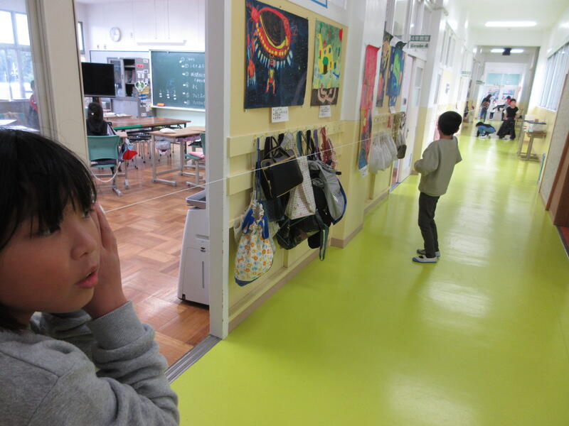 次は、廊下の端から端まで、約30mの糸をのばしました。すると、「糸をピーンと張っていれば聞こえた。」「友達の声が古いテレビみたい。」「糸を長くしても震えているのかな。」など、糸の震えと音の伝わり方をつなげて考えました。 (DI)