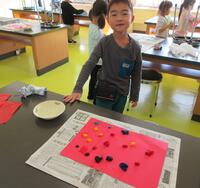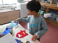 最後には自分たちで暗い箱の中に作品を入れ、ライトをつけて光り方を見てみました。「綺麗!」「ここの光り方が想像と違った」「もっと中身を入れてもいいかも!」など、完成した後も色々な発見があったようです。(KN)
