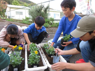昨日、後期に新しくなった環境委員会のメンバーで花の苗を60本植えました。植えた花の種類は、パンジー、ビオラ、ナデシコ、キンギョソウ、アリッサム、シクラメンです。委員会の子どもたちに花の名前当てクイズをしてみると、「キンギョソウってなんだ?」「金魚に似ているのかな。」「ヤマトナデシコ?」など、意外に知らない花が多かったようです。全校のみんなに花の名前を覚えてもらい、相和っ子班で育てるなど、工夫していきたいと考えています。(DI)