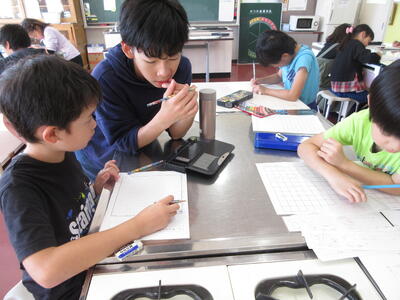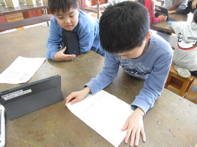 書き進める手が止まっている子に、上級生が声をかけアドバイスしている微笑ましい光景が、どの班でも見られました。