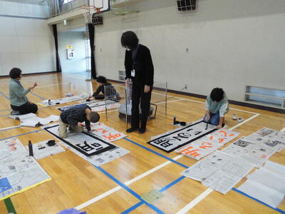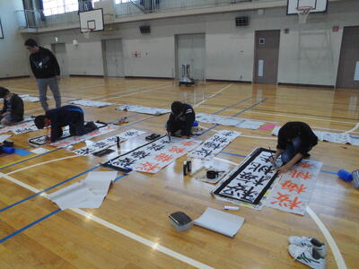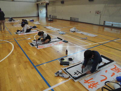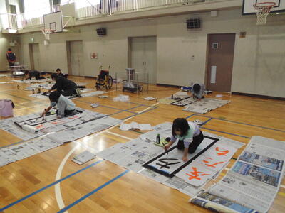 本日、1・2時間目に3・4年生、3・4時間目に5・6年生が体育館で書き初めを行いました。3年生は「友だち」、4年生は「明るい心」、5年生は「新しい風」を書きました。