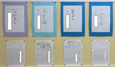 1年生の廊下は、「書き初め」と「本の紹介カード」を掲示しています。1年生の書き初めは、「ふじ山」または、「なかよし」です。今までに学習した「止め・はね・払い・折れ・曲がり・右上がり」や、「文字の中心をそろえる」ことを確認しながら書きました。